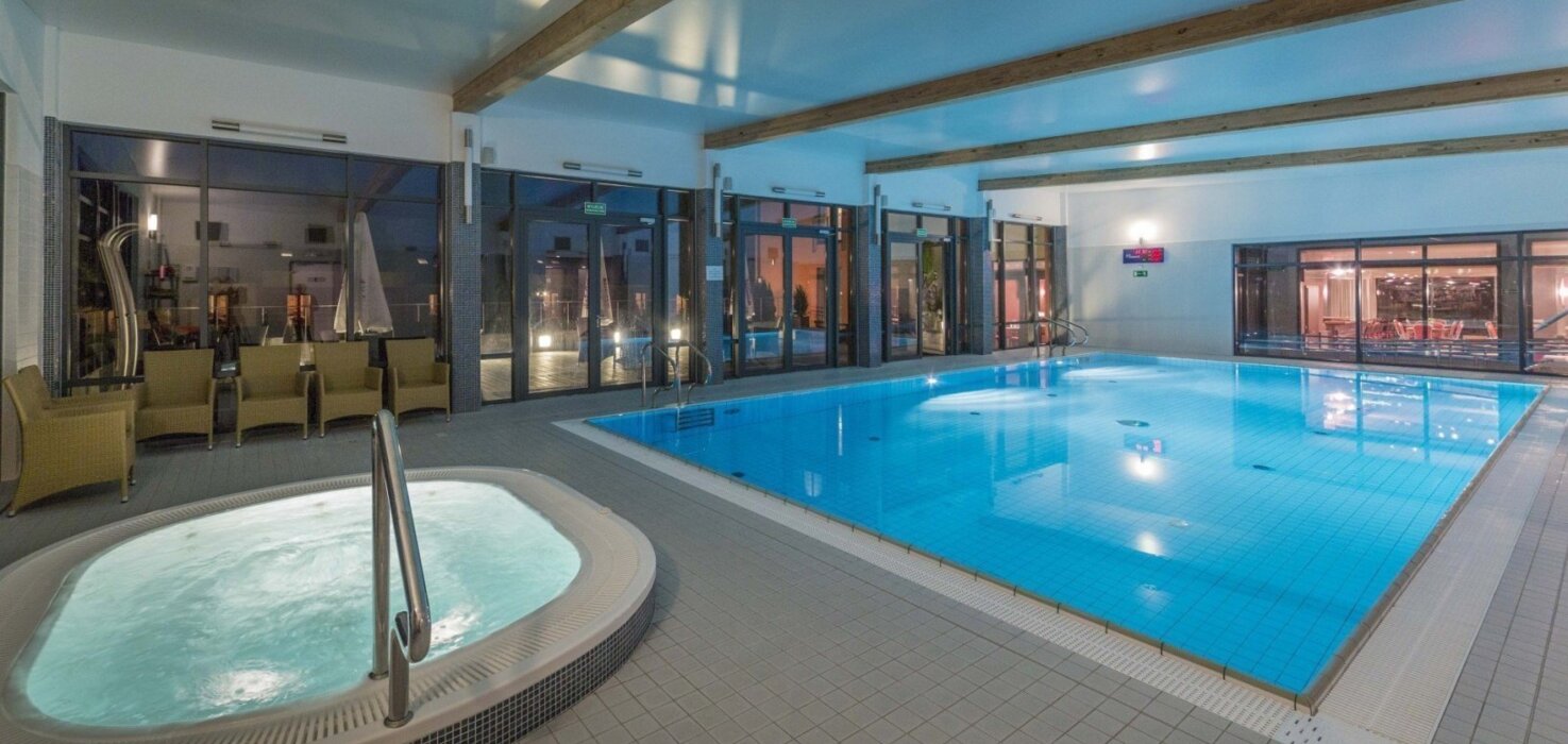 - kryty basen z przeciwprądem i dyszami masującymi, jacuzzi, sauną suchą i parową,